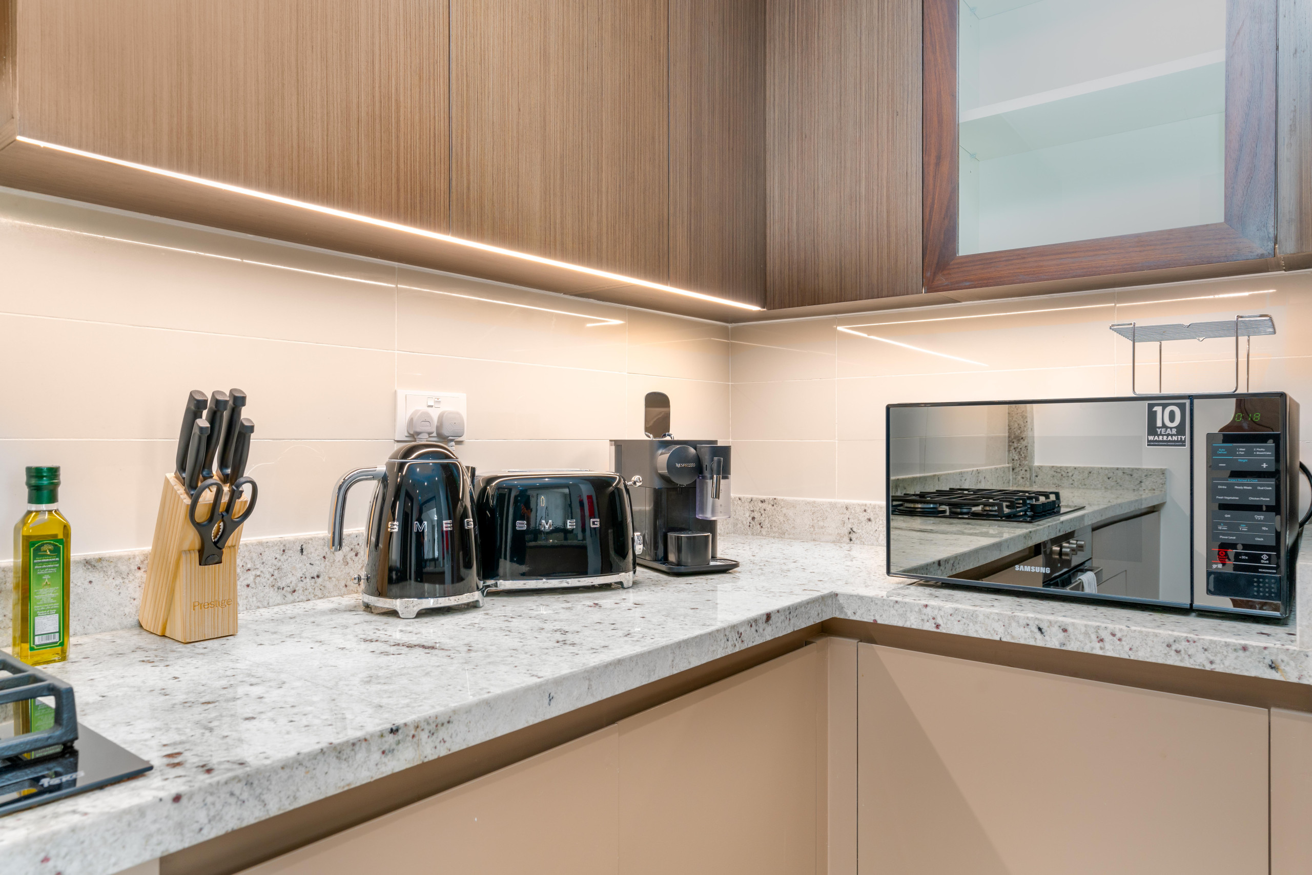 In der unabhängigen Induktionsküche sind Kühlschrank, Mikrowelle, Backofen, Gefrierschrank, Waschmaschine, Geschirrspüler, Geschirr/Besteck, Küchenutensilien, Toaster und Wasserkocher vorhanden.