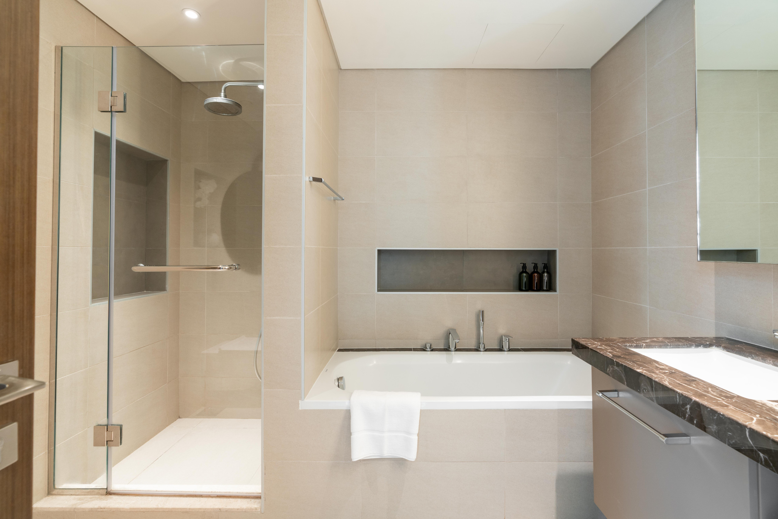 Angeschlossenes Badezimmer mit Badewanne + begehbarer Dusche