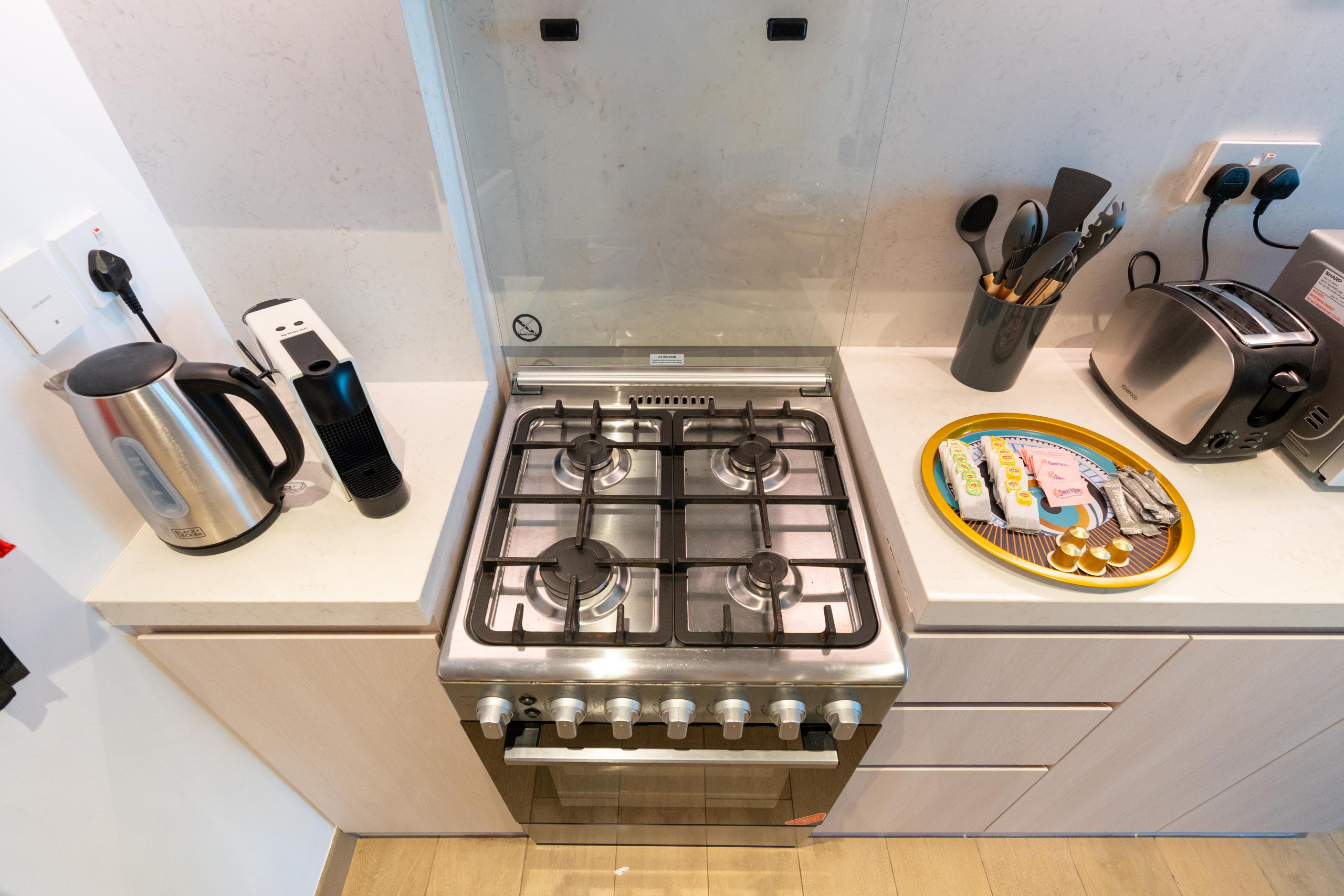 4. Fully Equipped Kitchen: The open-plan kitchen is equipped with modern appliances, including a refrigerator, stove, microwave, and all the cookware and utensils you need to prepare meals. Whether you're cooking up a gourmet dinner or a quick breakfast, you'll find everything at your fingertips.