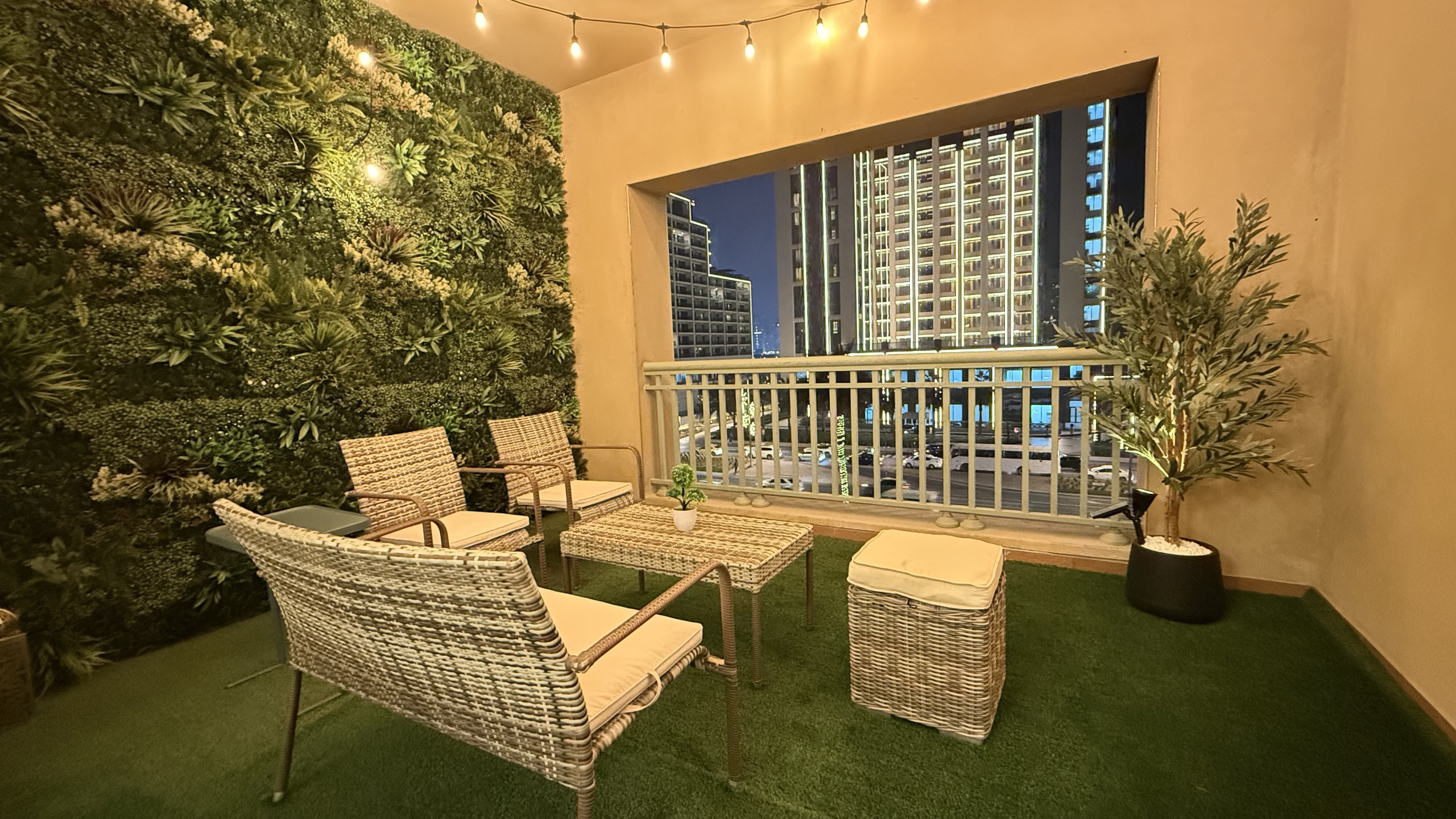 Private terrace balcony with chairs & table overlooking Palm Jumeirah street
