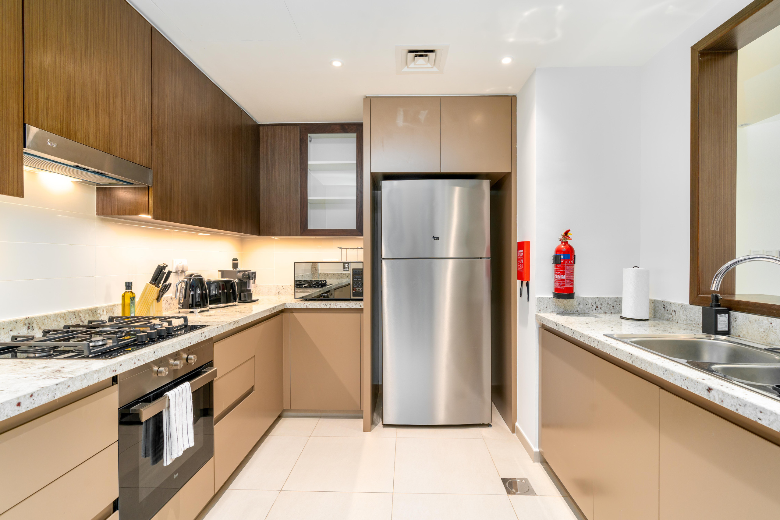 电磁独立厨房配有冰箱、微波炉、烤箱、冰柜、洗衣机、洗碗机、碗碟/餐具、厨房用具、烤面包机和水壶。 -